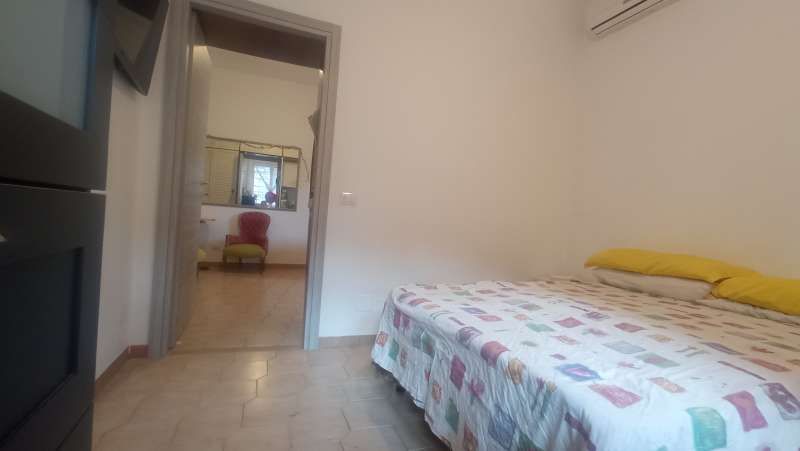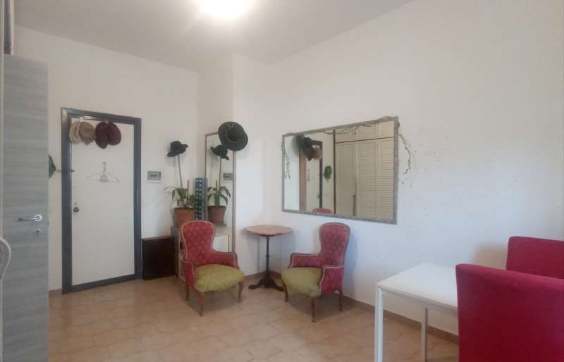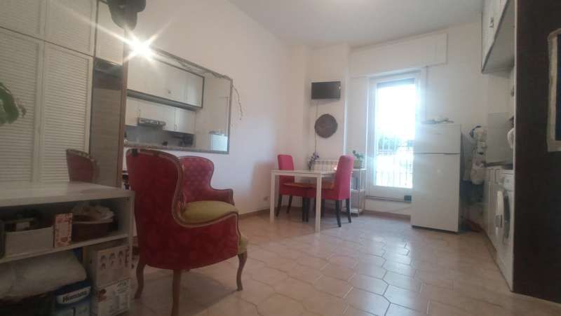 Piccolo soggiorno, angolo cottura, camera da letto, bagno e ampia terrazza non affacciata su strada ma su giardino condominiale dove due macchine hanno un parcheggio riservato, ma non vengono usate quasi mai.
