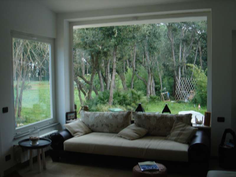 villa ristrutturata con giardino di 3000 mq. Al primo doppio salone aperto con grandi vetrate che lo circondano e danno sul giardino di confinante con il bosco di fregene, cucina due camere e due bagni. Al primo piano due camere e un bagno.