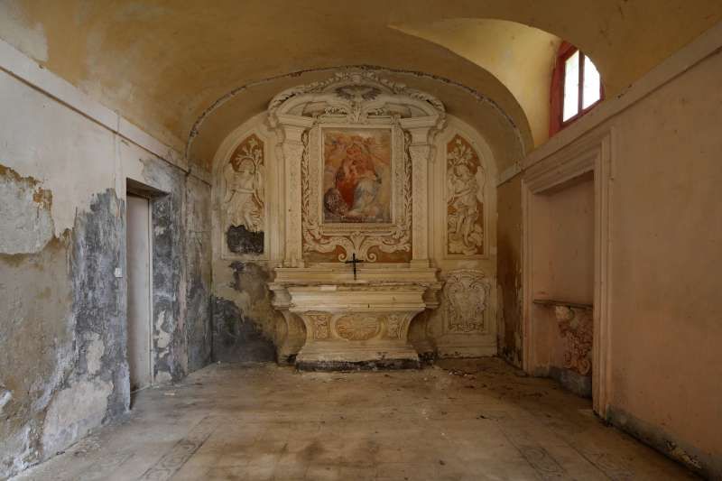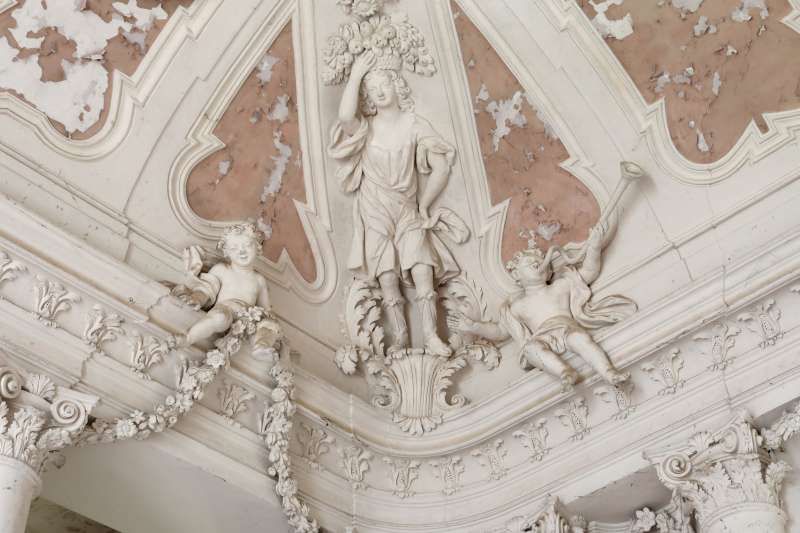 Il salone principale sito al primo piano, è ornato con stucchi che rappresentano figure allegoriche e putti sorreggenti ghirlande, la cornice perimetrale dalla quale si diparte la volta, poggia su colonne binate con capitelli in stile eclettico.