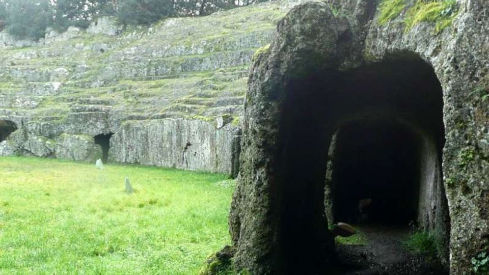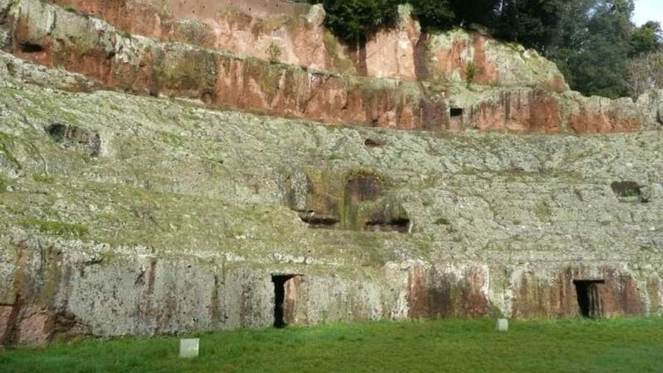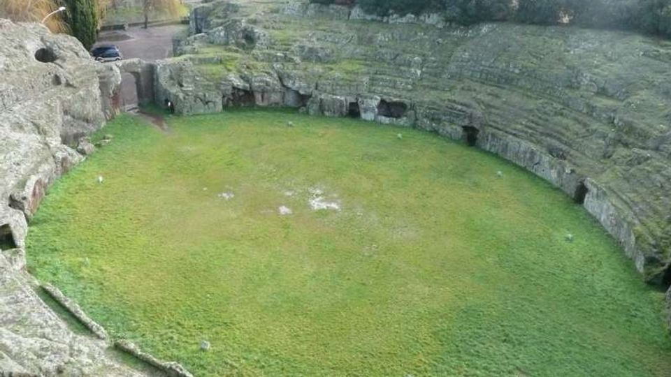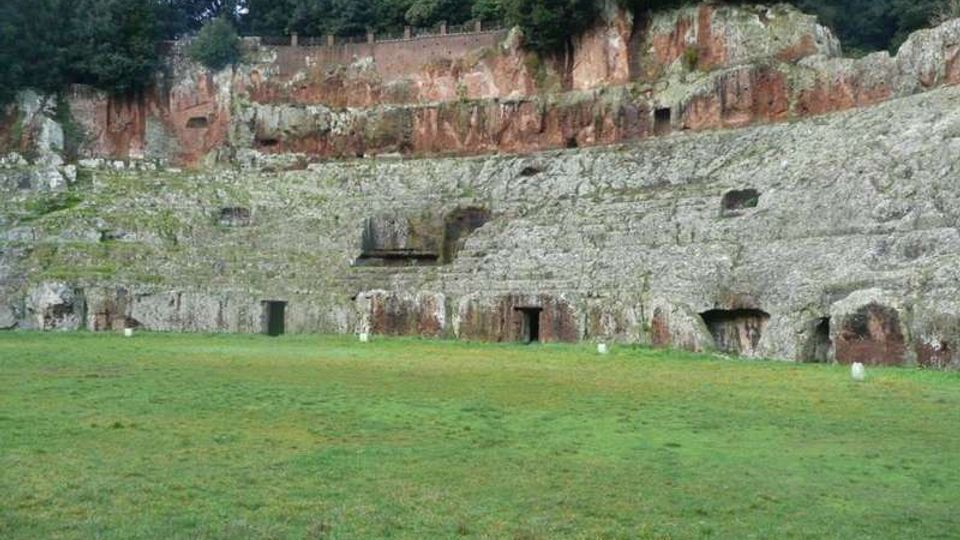 Databile al I sec. a.C.; completamente scavato nel tufo, probabilmente opera etrusca a scopo cultuale; restaurato da Statilio Tauro il Giovane. A pianta elittica, quasi circolare (m 55 x 45); corridoio a volta, come negli anfiteatri di Capua e Siracusa, gira intorno all’arena, corridoi d’accesso e porte d’ingresso. Restano tracce di mezzecolonne e nicchie decorative.