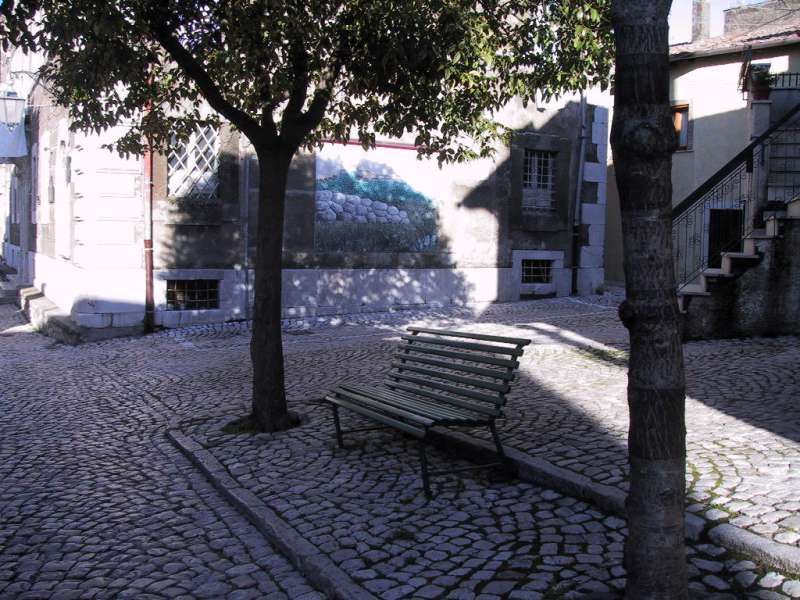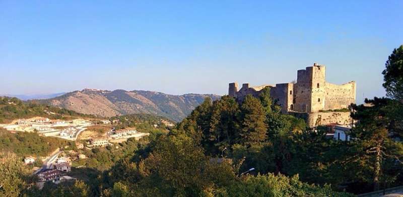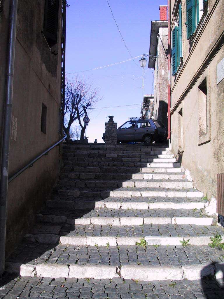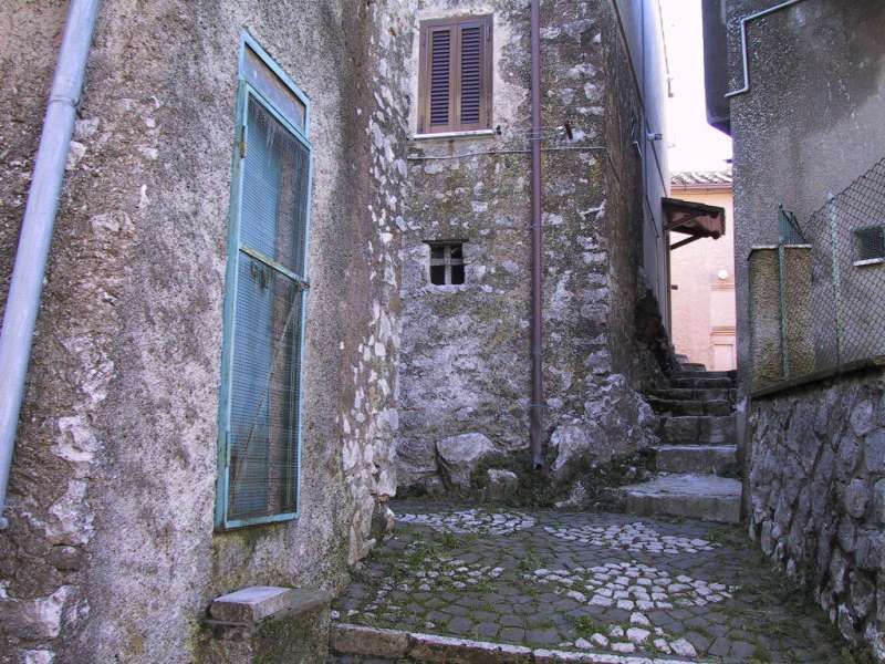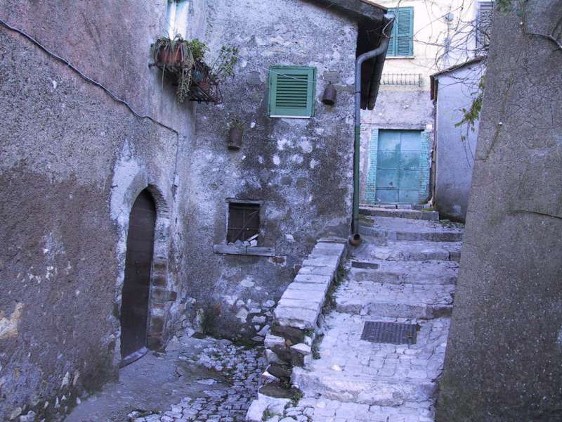 Borgo storico collinare dal carattere residenziale, con vicoli stretti in pietra e selciati acciottolati che si arrampicano tra edifici in muratura grezza e intonaci consumati, scanditi da portoni con grate metalliche, finestre con persiane, lanterne a parete e ombre nette sui gradini. Piccole piazzette con panchine e alberi offrono punti di sosta e texture autentiche, tra muretti in pietra, recinzioni a rete e dettagli come scale esterne e murali. L’ambientazione si apre anche su archi in pietra che incorniciano pendii rocciosi e vegetazione, e su ampi panorami del crinale con borgo, chiesa e una grande fortificazione in pietra, con valle e montagne sullo sfondo.