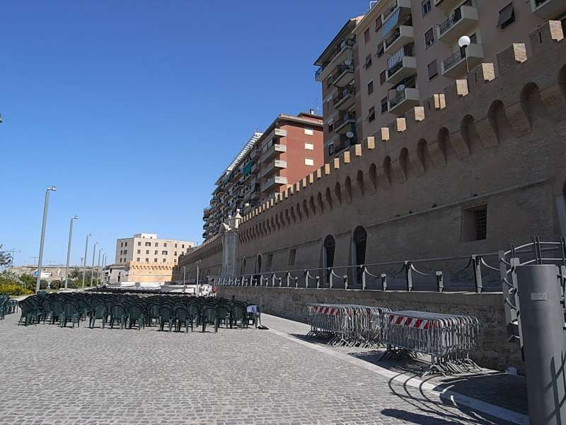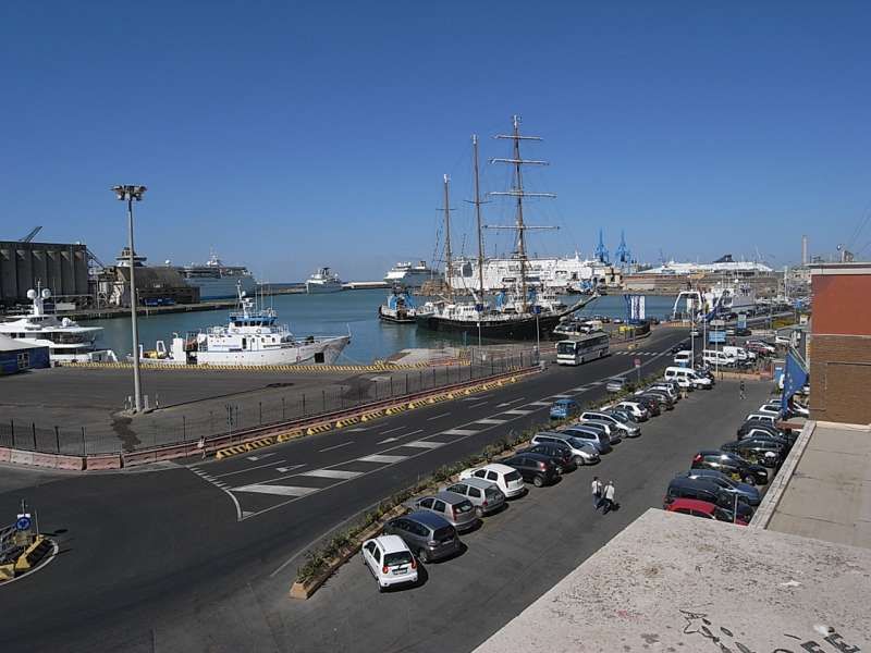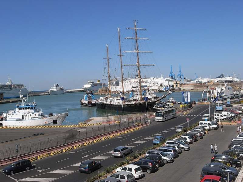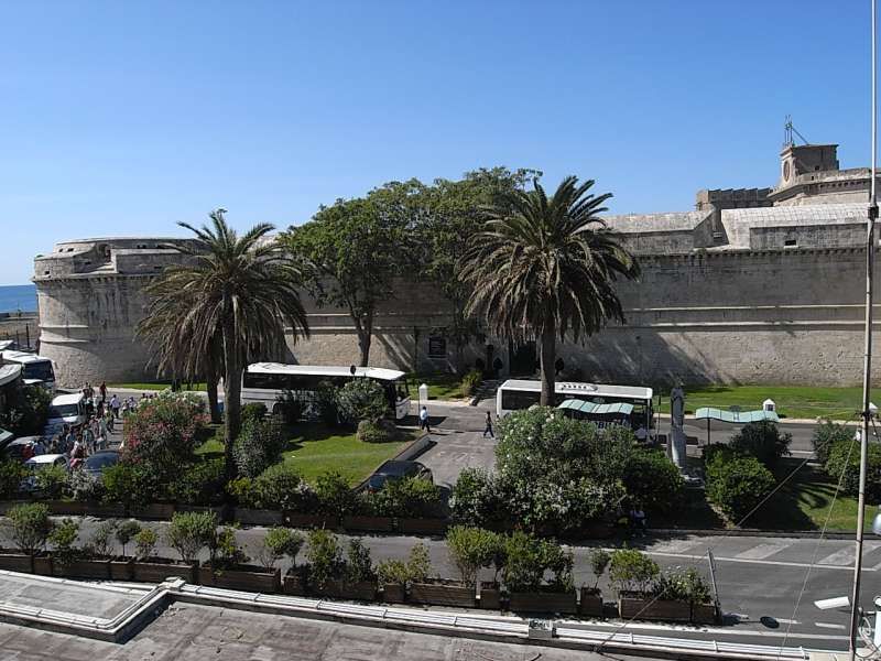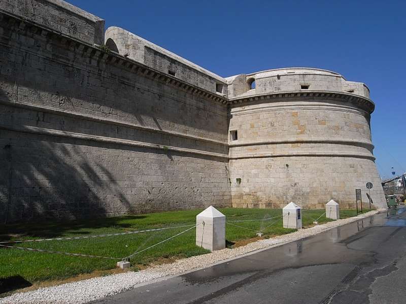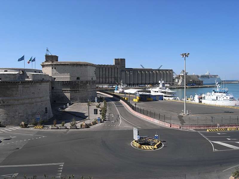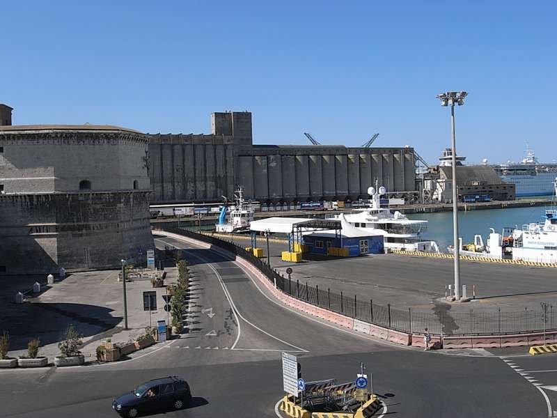 Grande fortificazione costiera storica in pietra chiara, con mura alte merlate, arcate e bastioni cilindrici arrotondati, affacciata direttamente sul mare e integrata nel tessuto urbano. Tutt’intorno si sviluppano ampie strade asfaltate, rotatorie e accessi portuali con banchine, traghetti e navi ormeggiate (anche un grande veliero a più alberi), oltre a lampioni, transenne e arredi da evento; sono presenti fasce verdi e giardini con palme, aiuole e vialetti. L’insieme offre un forte contrasto visivo tra architettura militare, traffico e infrastrutture del porto, con ampi spazi aperti adatti a riprese dinamiche e panoramiche.