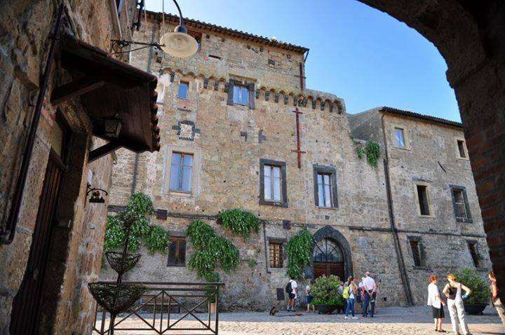 Borgo collinare storico e residenziale costruito quasi interamente in pietra, con case addossate dai tetti in coppi rossi, vicoli stretti e scalinate che si snodano tra archi e passaggi coperti, offrendo scorci profondi e atmosfere autentiche. Il profilo è dominato da una grande struttura fortificata tipo castello e da torri campanarie (anche con orologio), mentre una piazza lastricata con portici, persiane e arredi urbani crea un set naturale per scene d’epoca o contemporanee grazie alla presenza discreta di lampioni, cavi e antenne. Le viste panoramiche includono vegetazione fitta e colline verdi circostanti, con luce particolarmente suggestiva al tramonto sulle facciate in pietra.