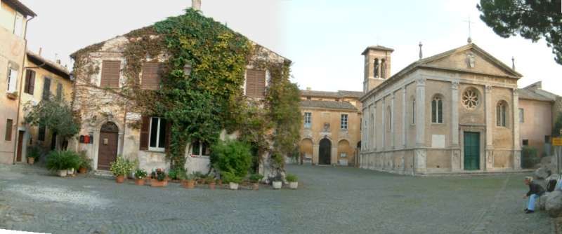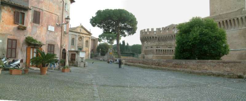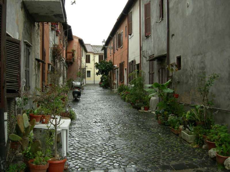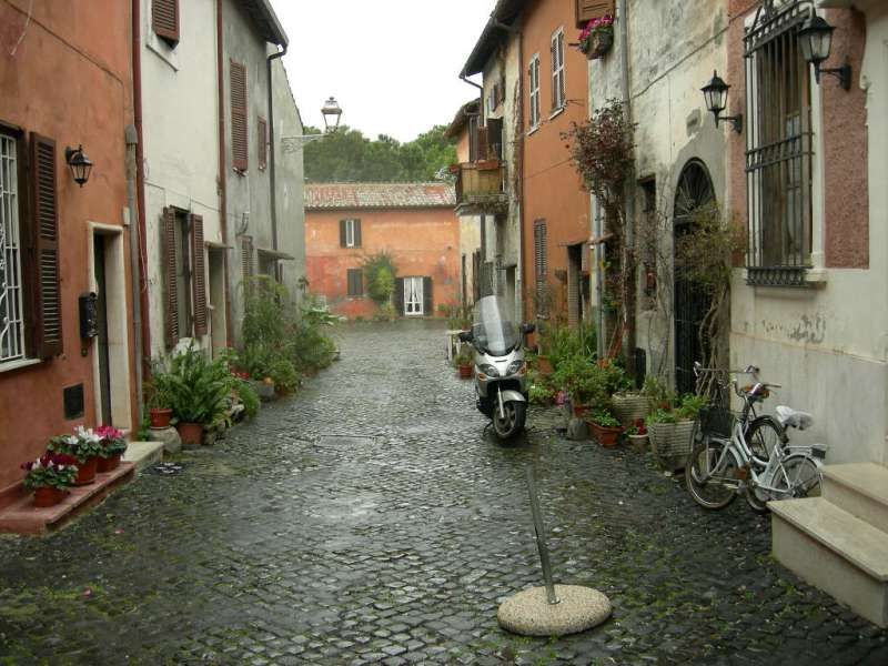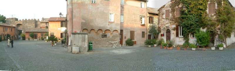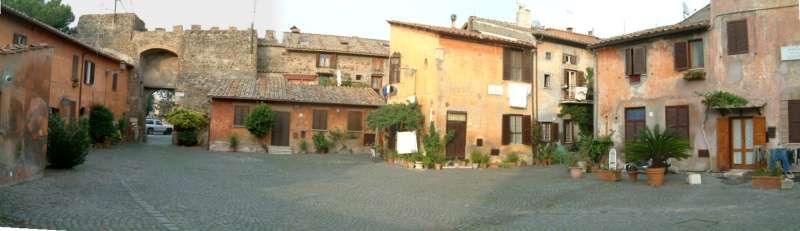 Borgo storico dall’atmosfera raccolta, con vicoli stretti acciottolati fiancheggiati da case residenziali a due piani intonacate, persiane in legno, lampioni a parete e numerosi vasi e fioriere che portano verde e colore lungo i muri. Si apre su un’ampia piazza lastricata in pietra, circondata da edifici in muratura nei toni ocra e rosati con archi e balconi, una piccola chiesa con facciata classica, rosone e campanile, e scorci di vegetazione rampicante. A margine della piazza domina una grande fortificazione in mattoni con mura merlate e alta torre cilindrica, incorniciata da alberi e arbusti, con un arco nelle mura che introduce a ulteriori strade oltre il centro abitato.