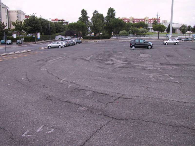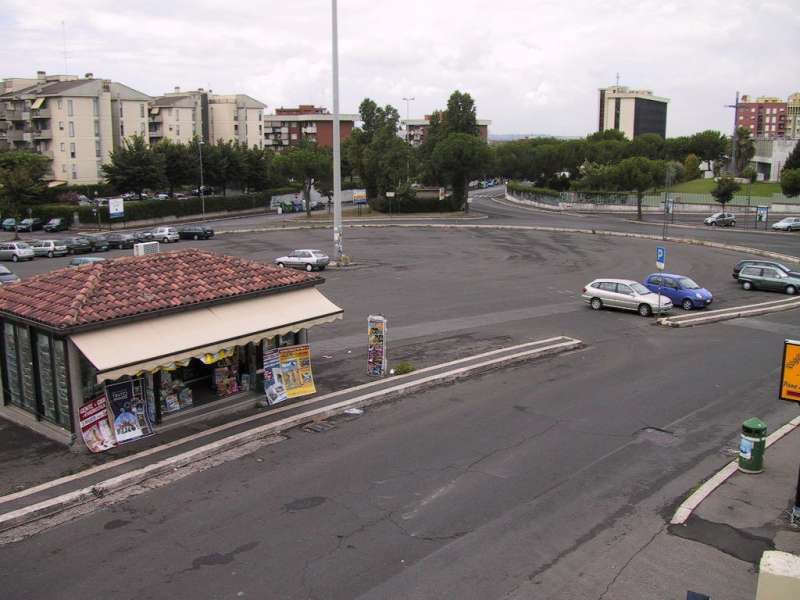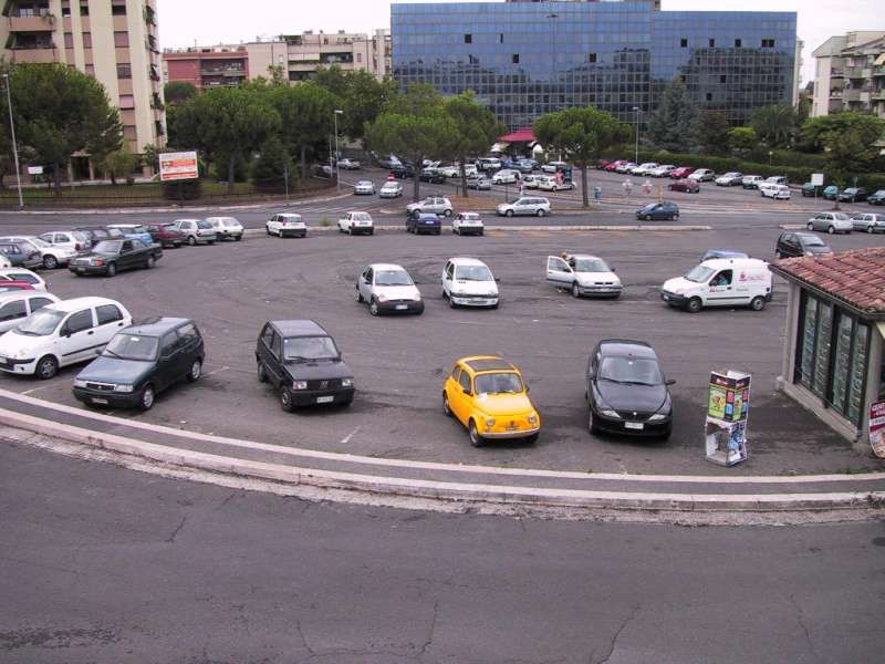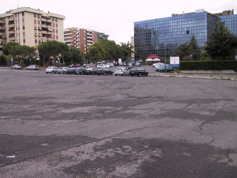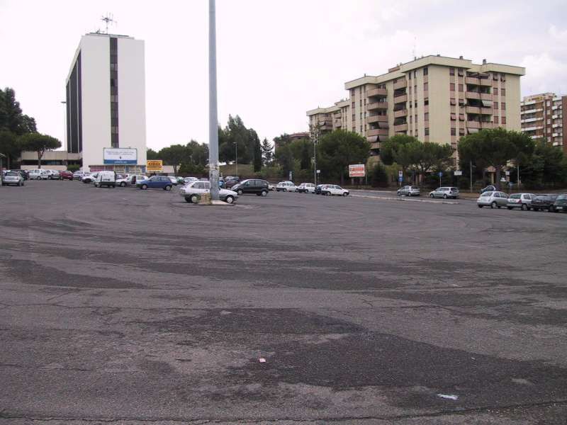 Ampio parcheggio esterno asfaltato, in parte organizzato come rotatoria, con segnaletica a terra in alcuni punti sbiadita, file di auto lungo i bordi e un alto palo della luce centrale. L’area è incorniciata da alberi, aiuole e strade di raccordo, con sullo sfondo palazzi residenziali con balconi e grandi edifici moderni, tra cui una torre bianca e una facciata in vetro riflettente. In primo piano può comparire un’edicola a un piano con tetto in tegole rosse, utile come elemento commerciale riconoscibile per scene urbane e di transito.