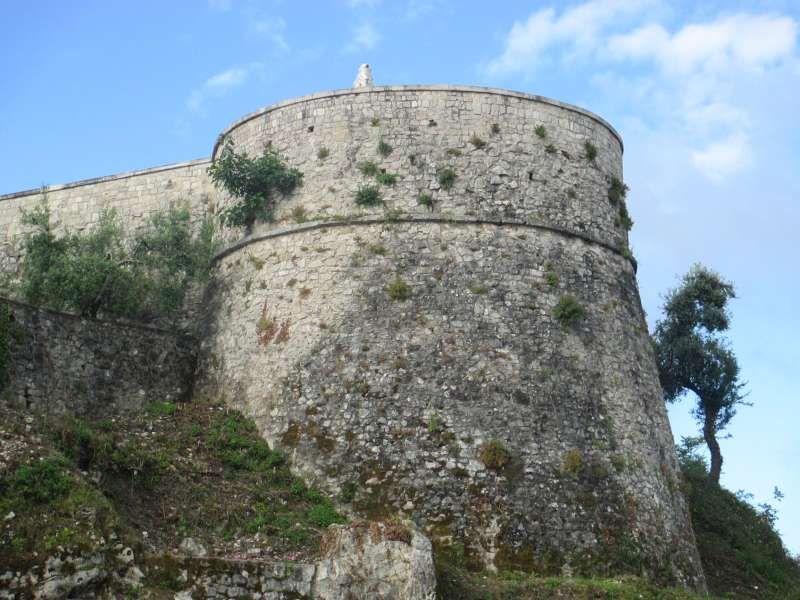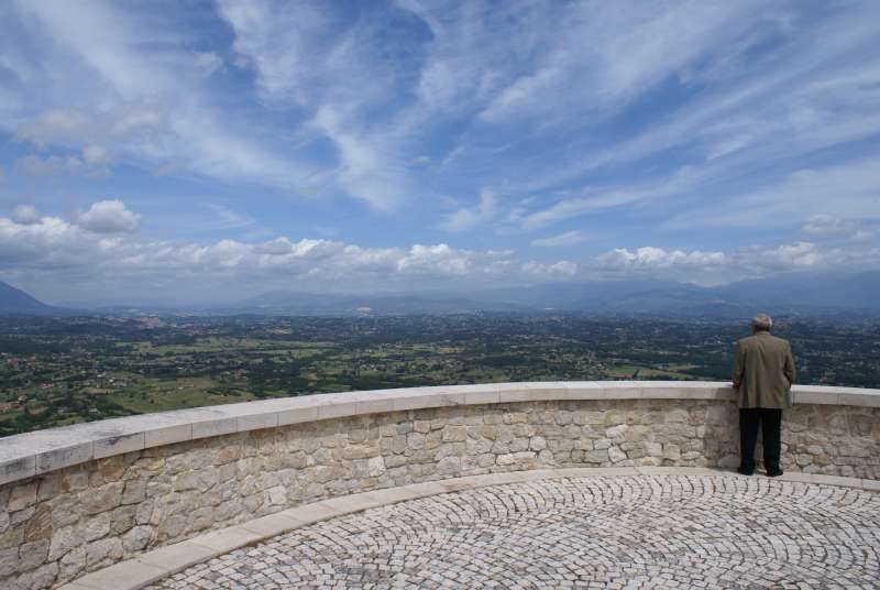 Antica rocca in pietra con una torre cilindrica dalle mura alte e massicce, adagiata su un pendio roccioso e in parte colonizzata da vegetazione spontanea, che offre un forte impatto storico e materico. All’interno si apre una terrazza panoramica in pietra con parapetto semicircolare e pavimentazione in ciottoli, affacciata su un’ampia valle verde con campi, centri abitati e montagne lontane sotto cieli ampi e luminosi. Sulla sommità è presente un monumento scultoreo in marmo con due figure abbracciate su piedistallo, ideale per inquadrature dal basso contro il cielo e per scene dal tono simbolico e culturale.