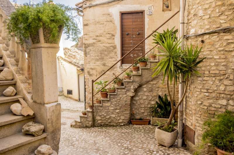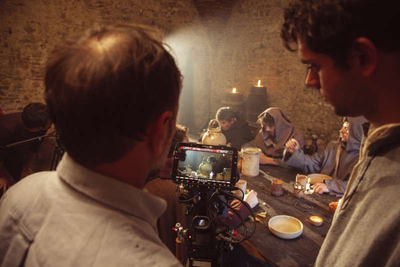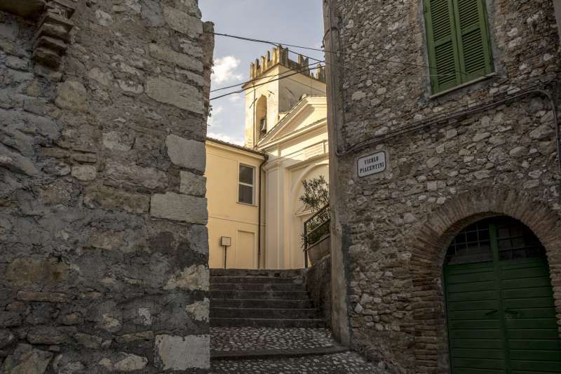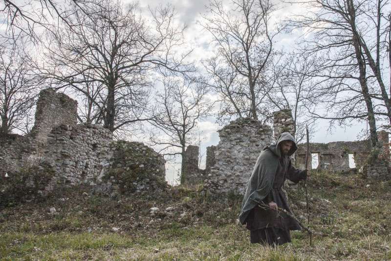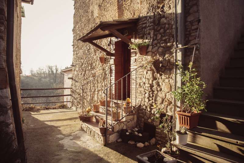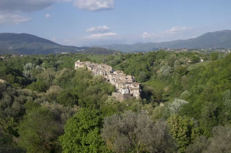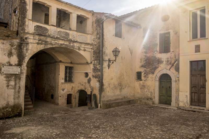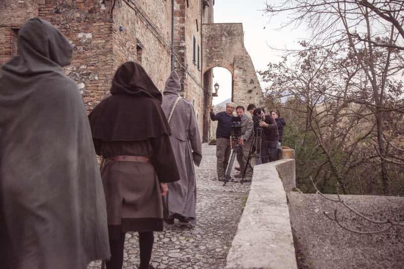 Piccolo borgo storico arroccato su un crinale, con case addossate in pietra e intonaco consumato, vicoli acciottolati con scalinate, archi, portali in legno, lanterne e una piazzetta lastricata dove la luce radente valorizza le facciate; in fondo alle strade si intravede anche una chiesa con campanile. Intorno si apre un paesaggio naturale di colline e montagne, con filari di cipressi, vegetazione fitta alternata ad alberi spogli, un sentiero sterrato in area boschiva attraversato da un piccolo corso d’acqua e rovine in pietra su pendio erboso, offrendo ampie possibilità di riprese panoramiche e d’atmosfera. È presente anche un interno rustico tipo taverna/cantina in pietra con volta in muratura e lungo tavolo di legno illuminabile in modo scenografico, adatto a set intimi e period drama.